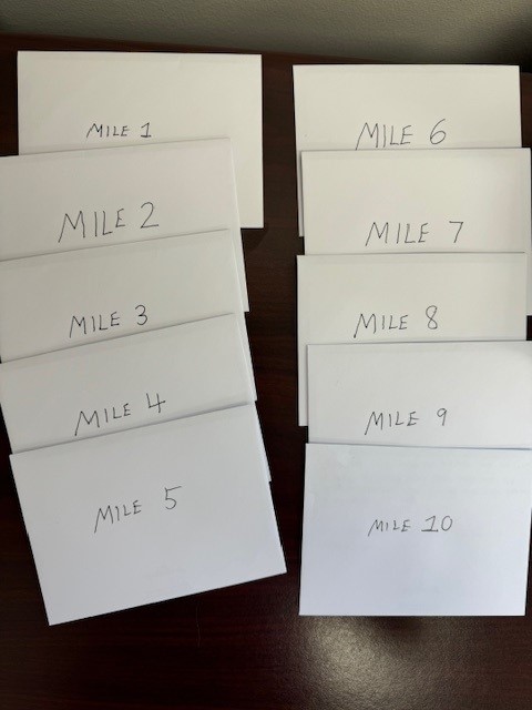 Mile 9 (Change) – Cale had to walk this mile backwards. His calves were burning at the end. Walking backwards represented the difficulty of change.